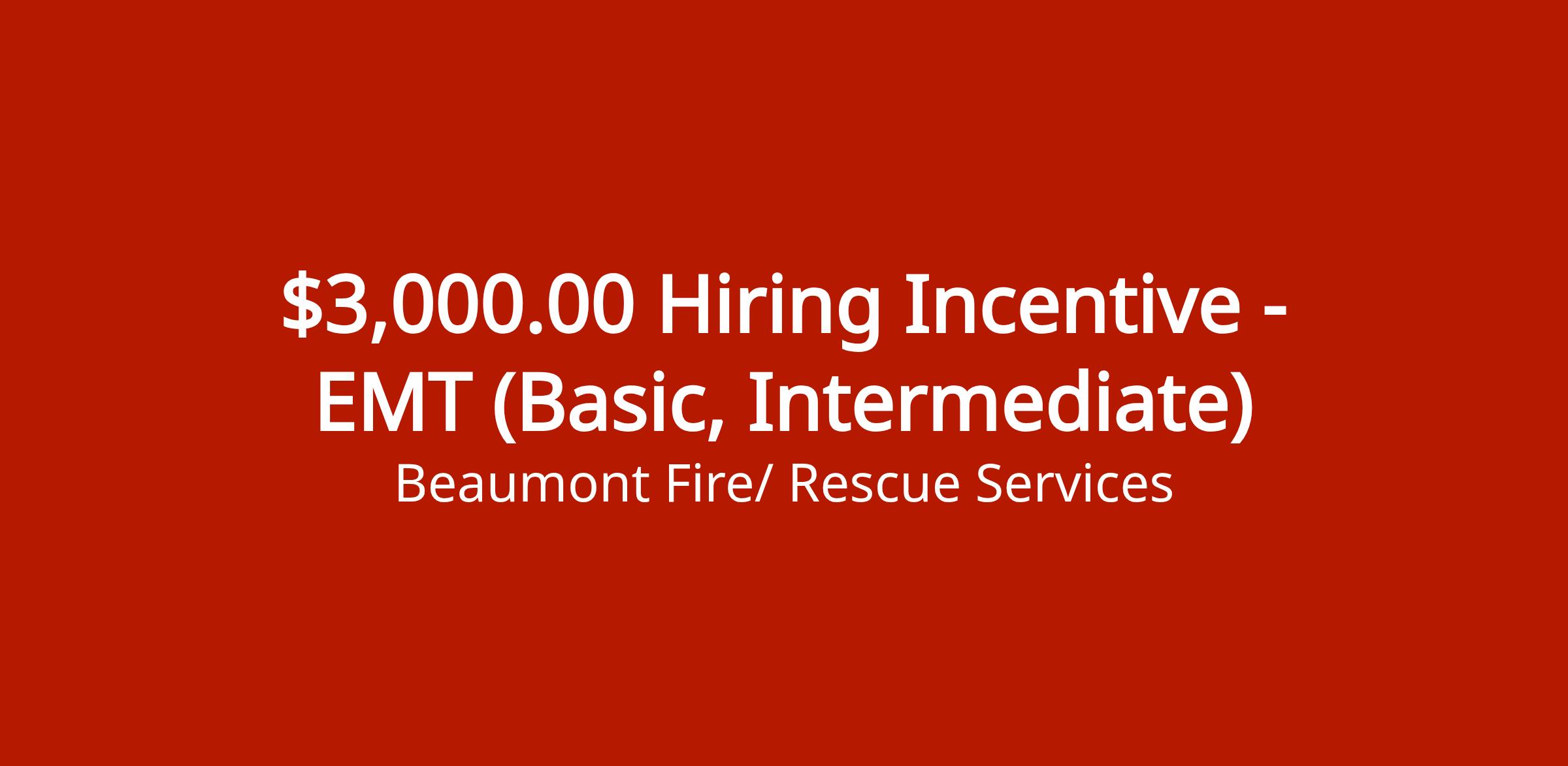 EMS crew member responding to emergency and non-emergency calls, providing medical care on scene and en route to hospital, operating response vehicles, maintaining equipment, and instructing public on emergency care. Includes $3,000 hiring incentive.