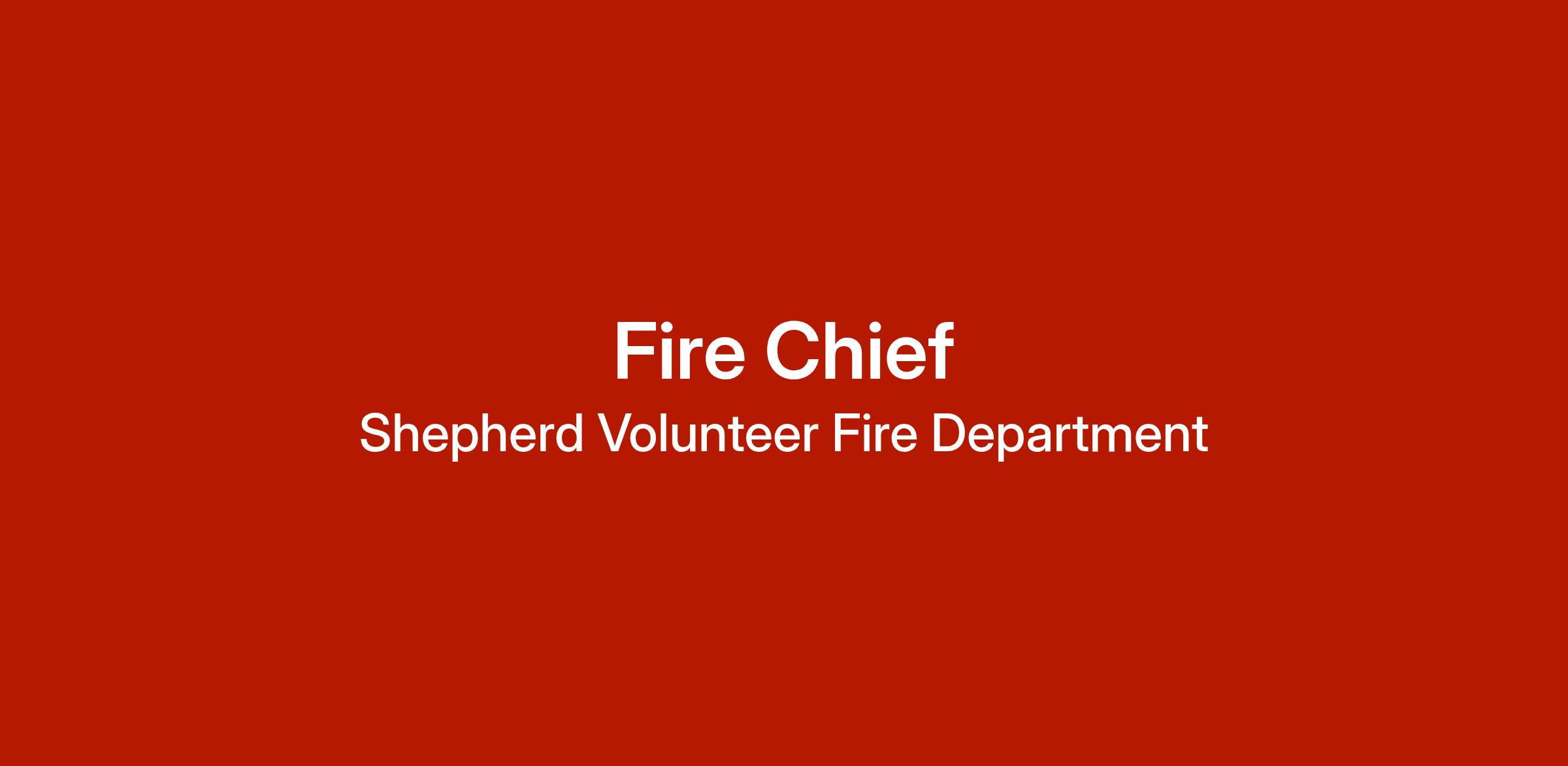 The Shepherd Volunteer Fire Department is looking for a qualified and dedicated Fire Chief to manage and oversee all departmental operations while leading a volunteer workforce. This position is responsible for protecting the Shepherd Fire Service Area through emergency response, administration, training, and coordination with partner agencies.