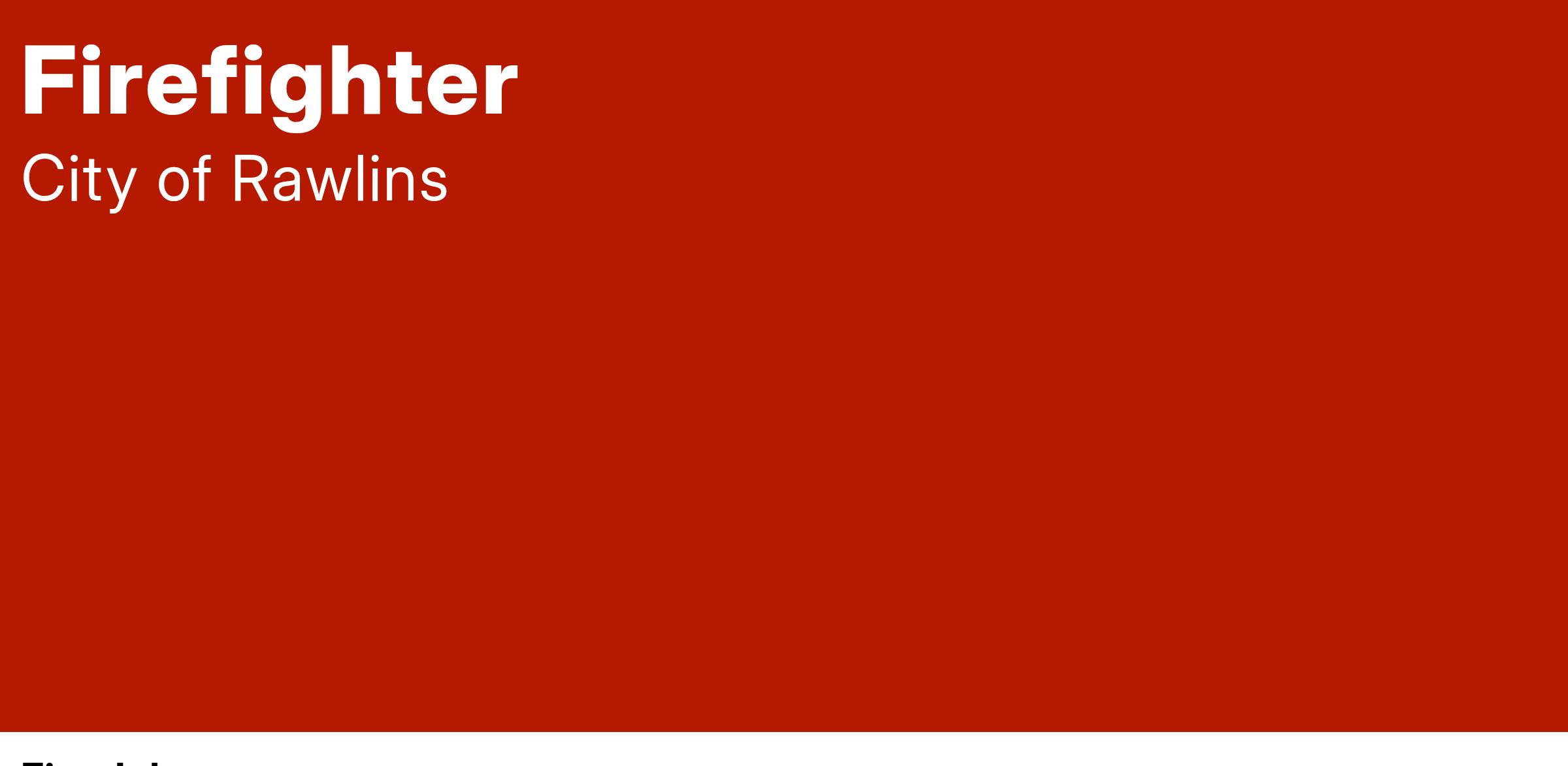 Physical and oral interview testing will be conducted on May 29th at the Rawlins Fire Department Training Center located at 501 1/2 E. State Street, Rawlins, Wyoming beginning at 1400 hours on May 29th 2025. A list of successful applicants will be considered for employment with the Rawlins Fire Department. Post-offer preemployment physical and drug test required.