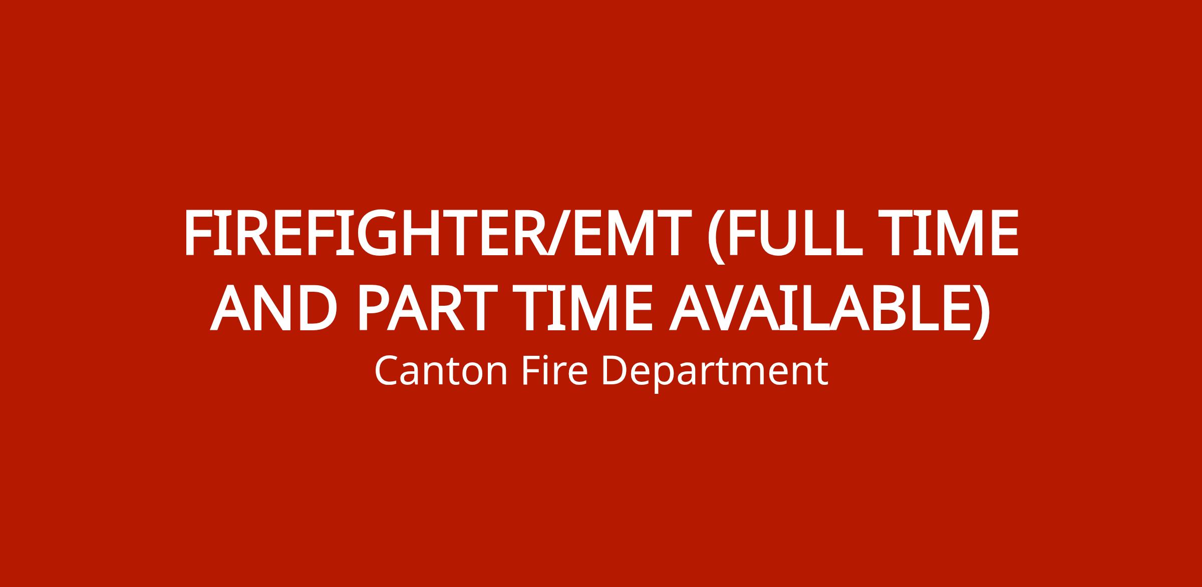 Firefighter/EMT position with the Canton Fire Department. Full-time and part-time positions available. Applicants should submit the General Employment Application with resume.