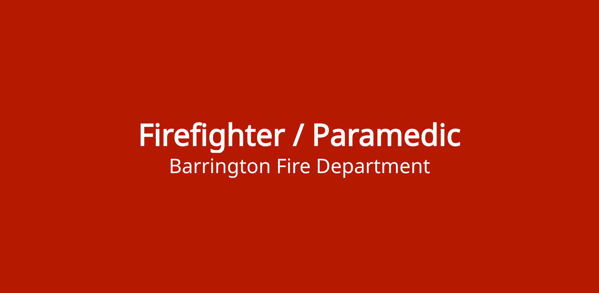 Firefighter/Paramedic position with the Barrington Fire Department. Full-time position with comprehensive benefits including competitive salaries, paid time off, medical/dental/vision insurance, and Fire/Police Pension programs.