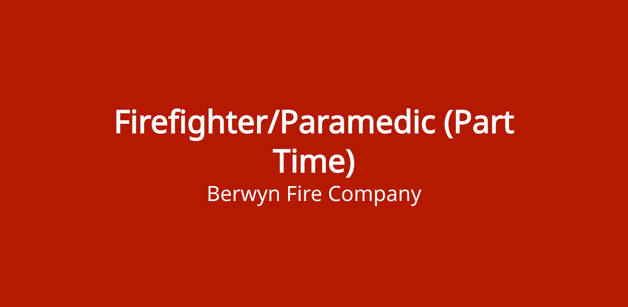 Requirements: 21 years old, valid PA Driver's License, PA Paramedic Certification with EMSVO, Firefighter 1 Certification (Pro-Board or IFSAC), Vehicle Rescue Operations, Hazardous Materials Operations, EVOC or EVDT, Fire Pump Operations 1, NIMS IS 100/200/700/800, current PALS and ACLS, ability to pass NFPA physical and background checks